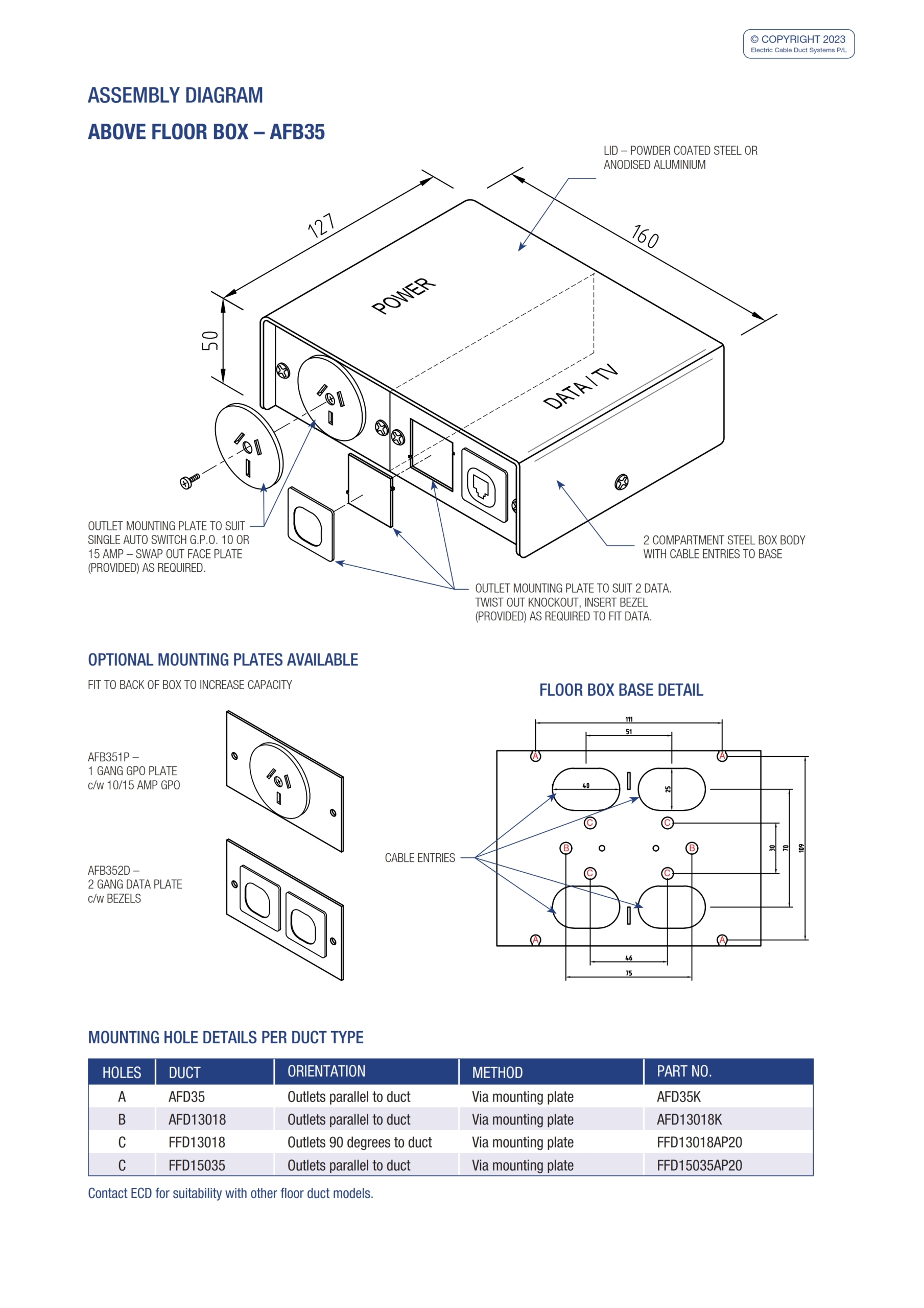 - Can be used in conjunction with AFD35 Above Floor Duct or as a stand alone floor box.