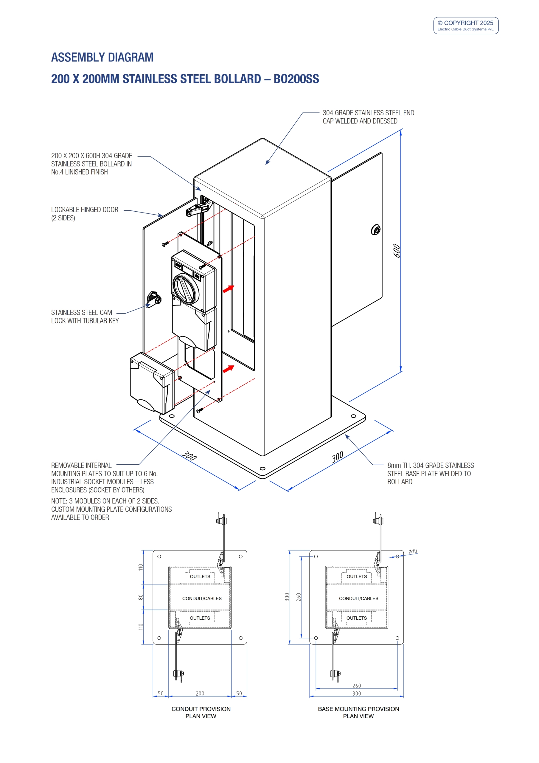 • Capacity for 6 No. IP66 industrial socket modules – power. Data can be used with optional factory fitted segregation.