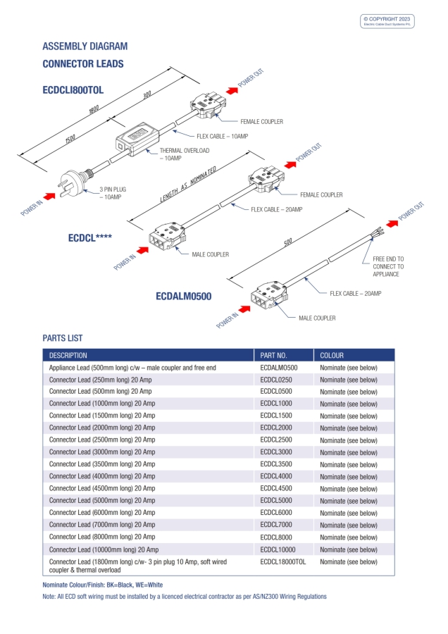 - Male to female soft wiring connector leads (20 Amp) are available in lengths from 250mm to 10,000mm.