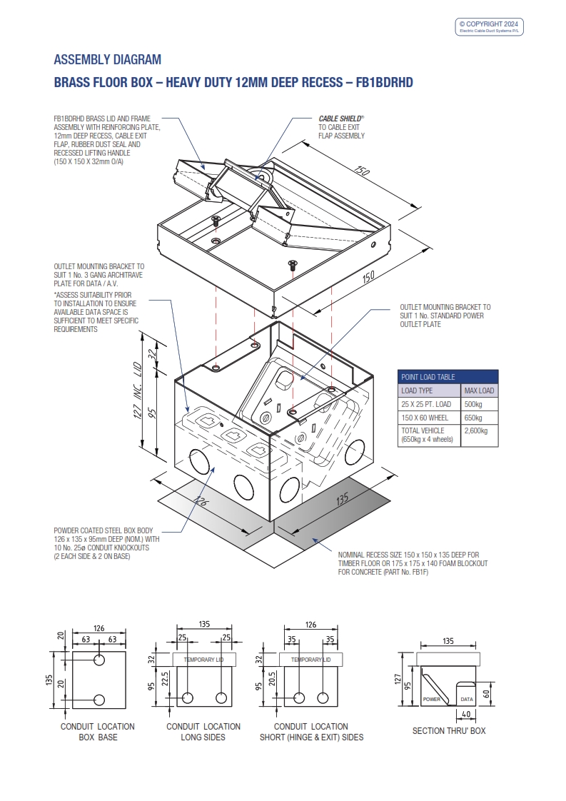 - Heavy duty – load rated floor box suitable for vehicular traffic.