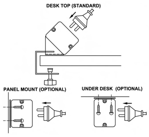 - Fixing via standard ‘C’ clamps – the ‘C’ clamp accommodates a desk top thickness of between 23mm to 35mm. To tighten the clamp use thumb wheel fitted. (Two clamps required to secure each box. Other fixing methods available to order.) Catalogue No. DMC2335