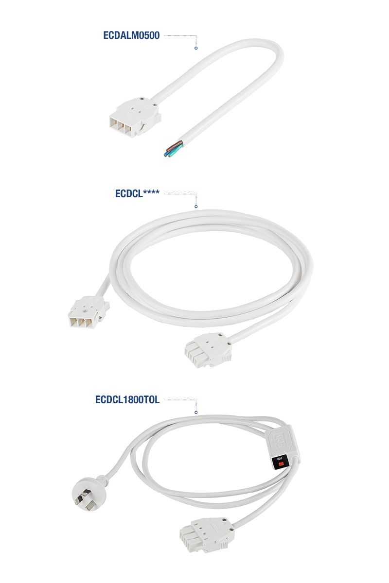 - ECDCL1800TOL connects from a standard 10 Amp 3 pin socket to a soft wired
