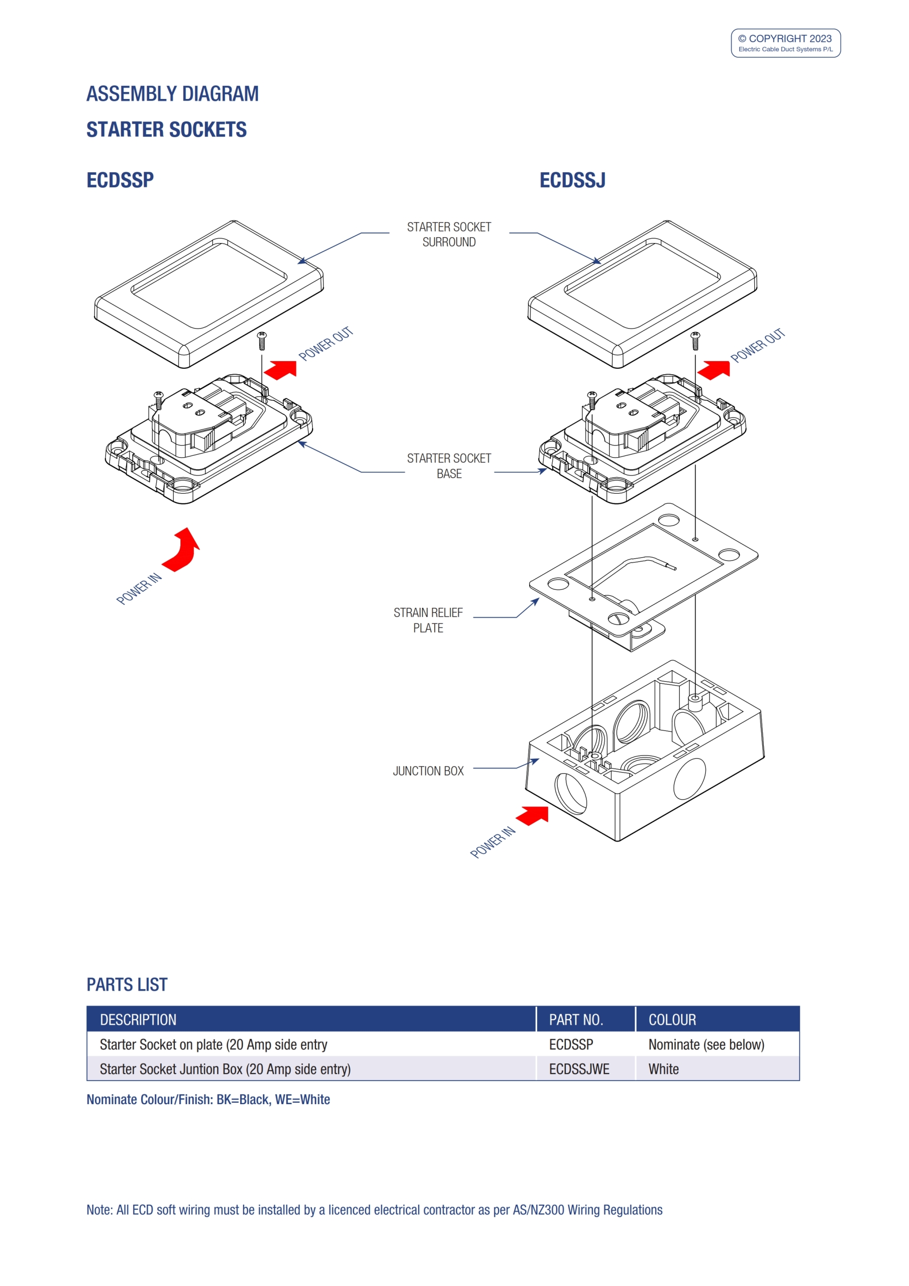 - Starter Socket Junction Box (ECDSSWSSJ) is typically used for mounting in false floor or ceiling spaces where not visible or readily accessible.
