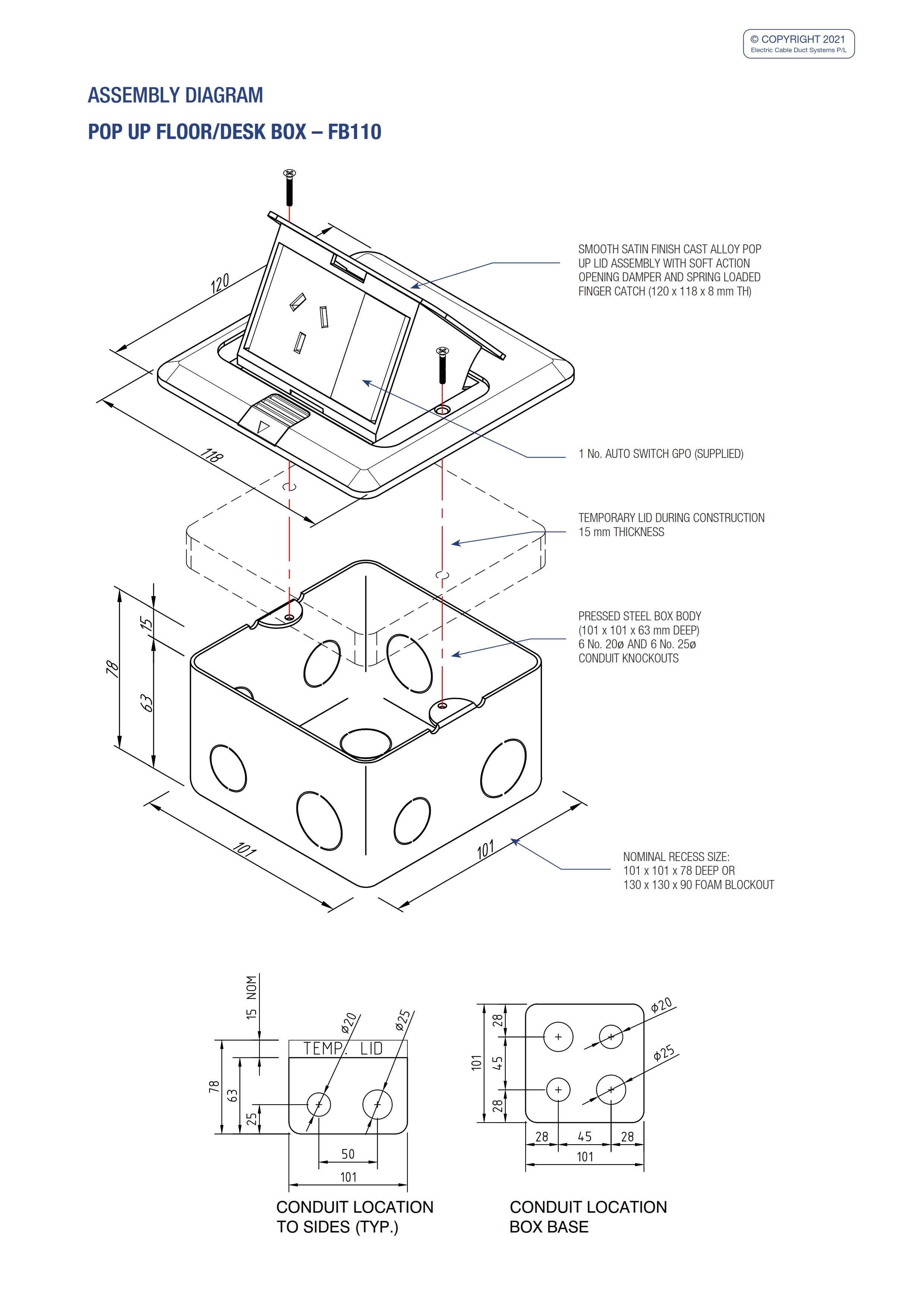 - The FB110 Pop Up Floor/Desk box has a capacity of 1 no. auto switch GPO (supplied).