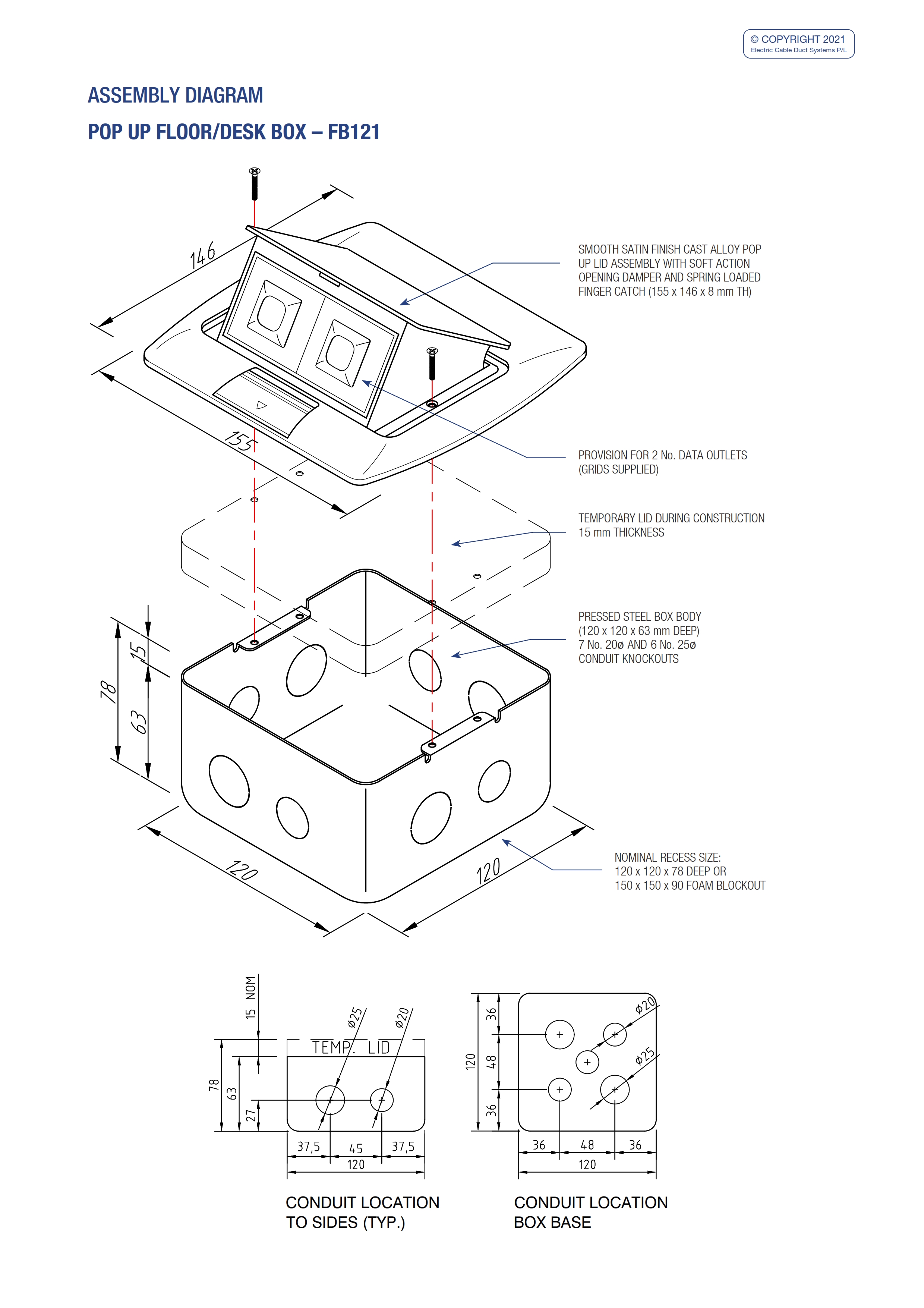 - The FB121 Pop Up Floor/Desk box has a capacity of 2 no. data mounts (grids supplied).