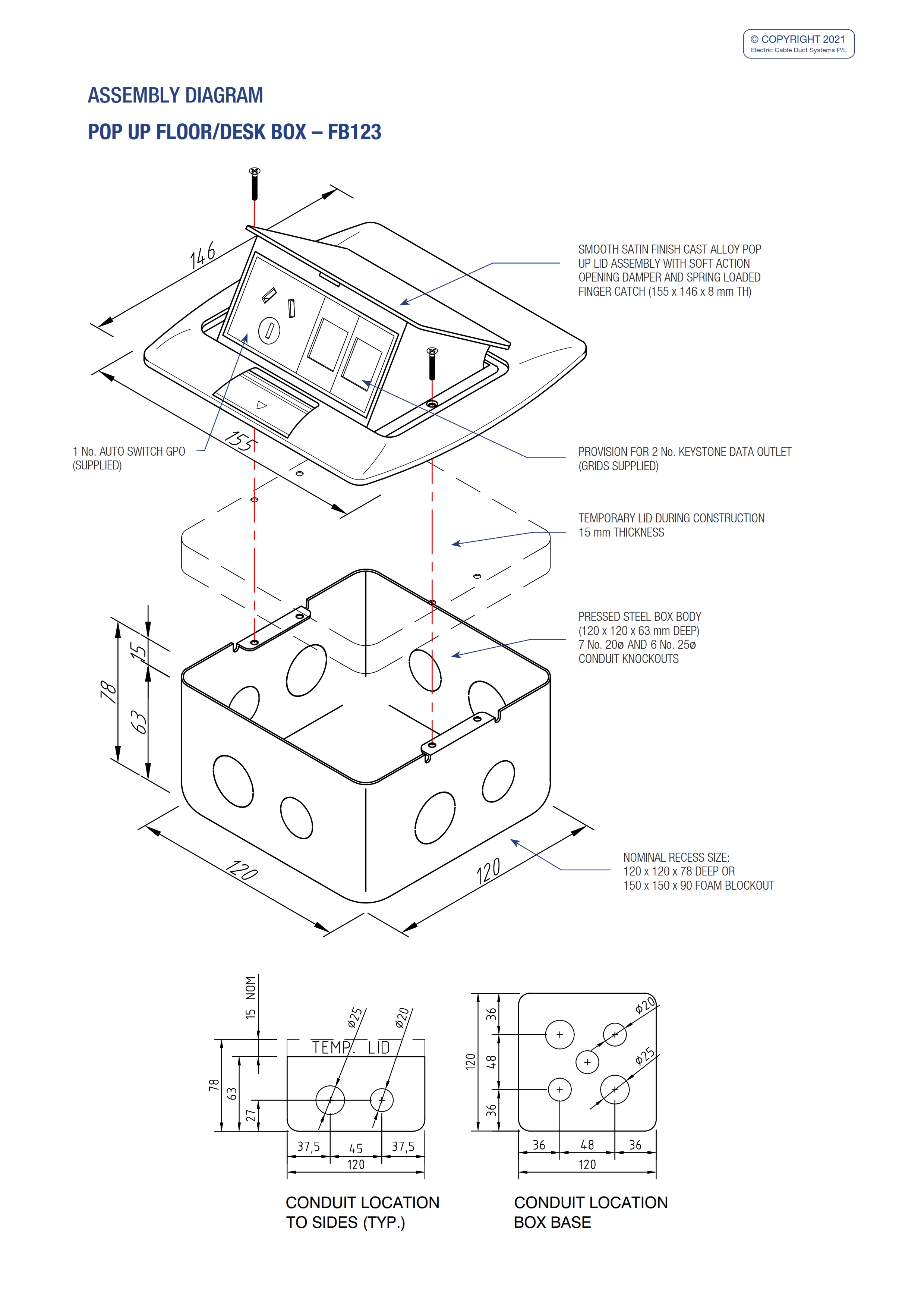 - The FB123 Pop Up Floor/Desk box has a capacity of 1 no. auto switch GPO (supplied) and 2 no. Keystone data mounts (grids supplied).
