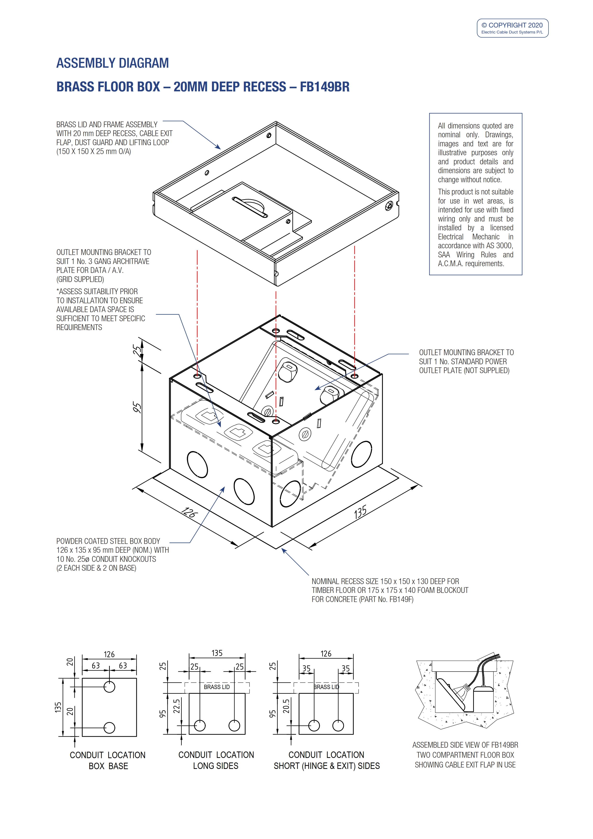 - Recessed brass lid and frame with 20 mm rebate for floor finish (typically polished timber boards or ceramic tiles).