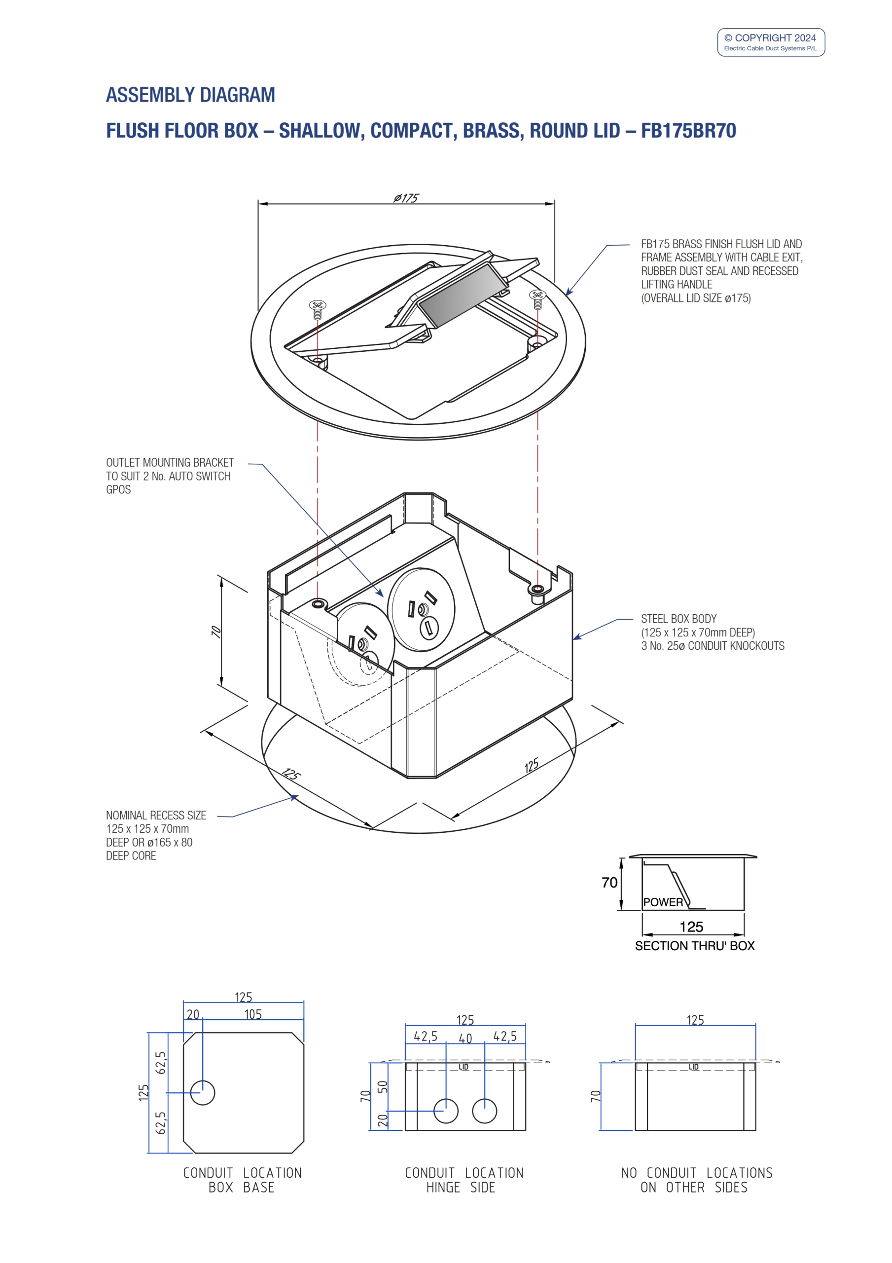 - Shallow, compact and stylish, the FB175BR70 Series of Flush Floor Boxes provide ready access to power outlets recessed in the floor.