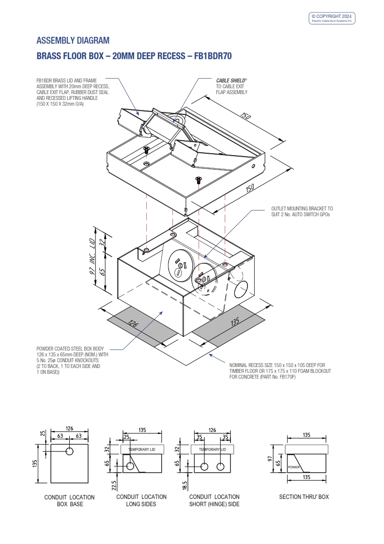 - Recessed brass lid and frame with 20mm rebate for floor finish (typically polished timber boards or ceramic tiles).