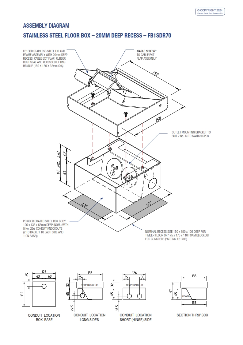 - Recessed stainless steel lid and frame with 20mm rebate for floor finish (typically polished timber boards or ceramic tiles).