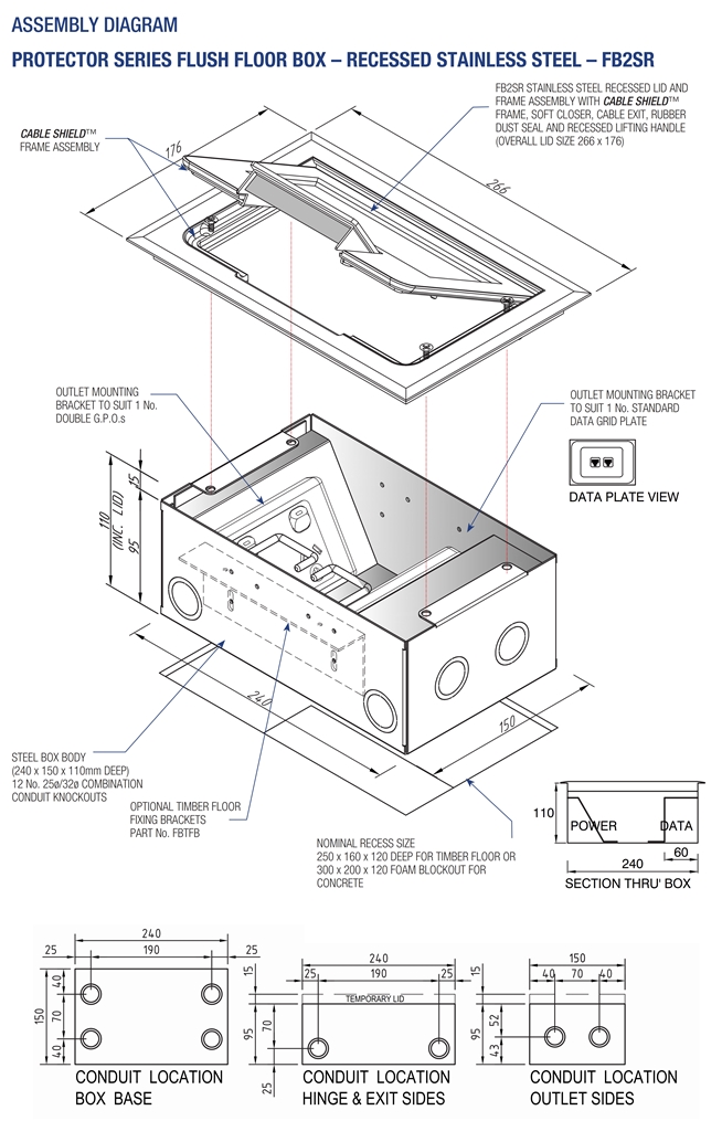 - Recessed “Protector” Series Stainless Steel Lid and Frame with 6mm rebate for floor finish (typically carpet or vinyl).