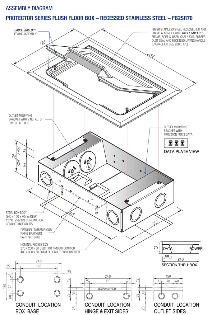 - Modular box body and lid design, interchangeable with plastic and other lids in the ECD floor box range.