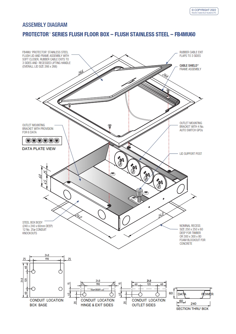 - Rubber cable exit flaps to all three sides enables cables to safely exit the lid at any point.