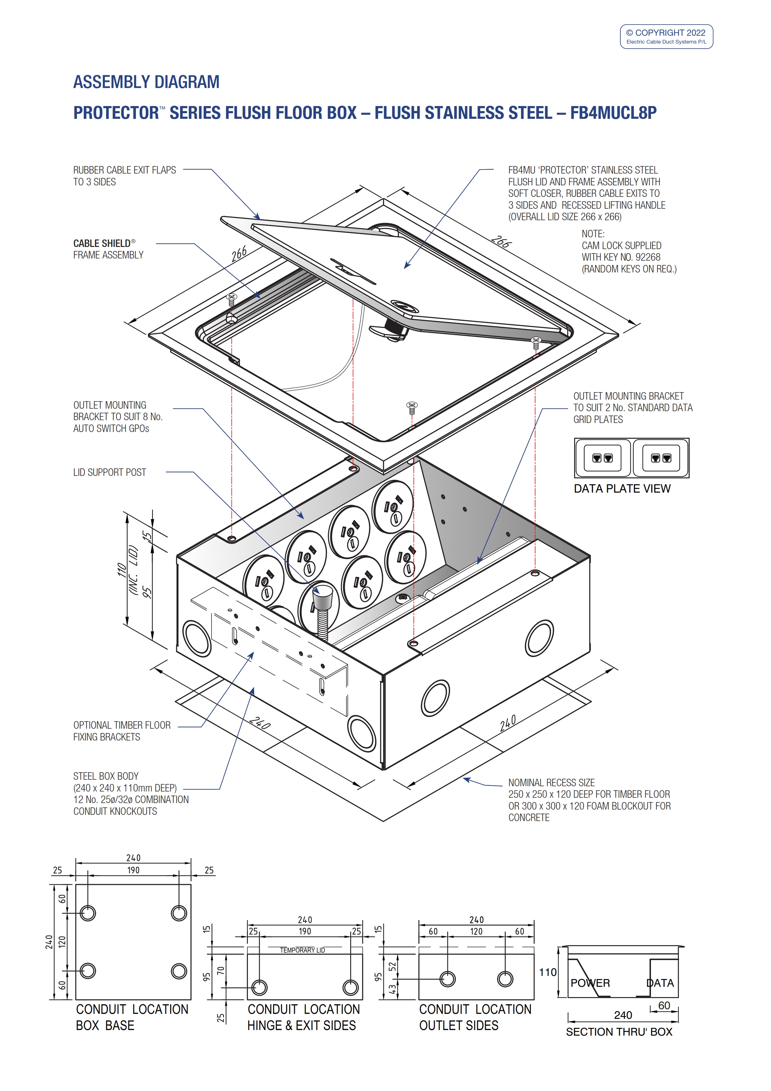 - A lockable floor box supplied with cam lock fitted. Cam locks can be keyed alike to key number 92268 or randomly keyed.