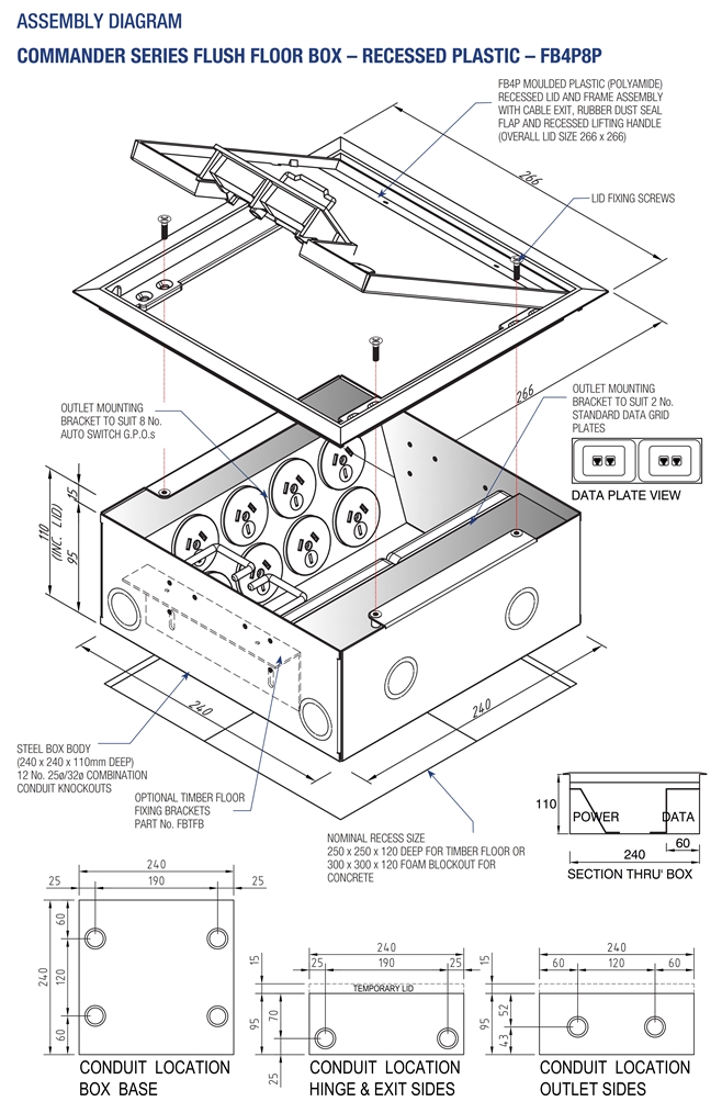 - Capacity for 8 Auto Switch G.P.O.’s & 2 standard Data plates (8 x power & 2 x Data and/or A.V.).