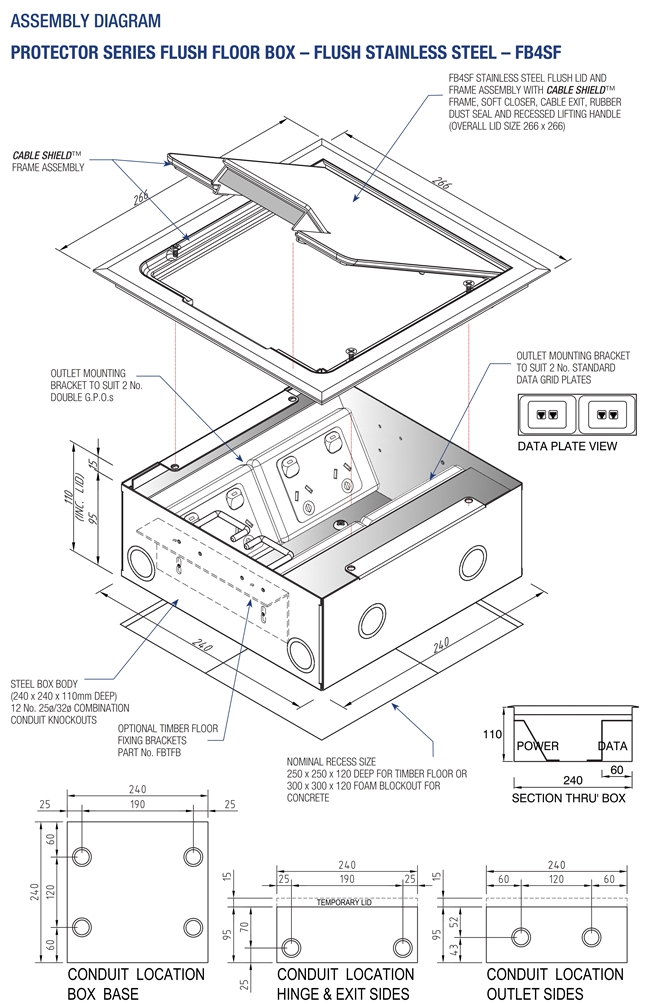 - Capacity for 4 standard outlet plates.(2 x double power & 2 x Data and/or A.V.)