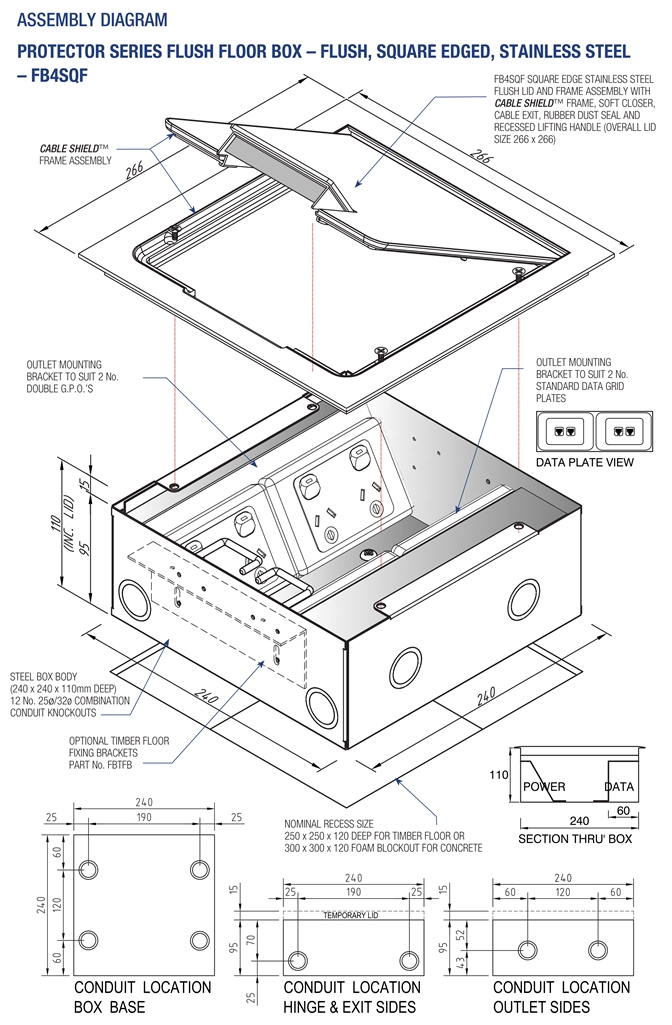 - Modular box body and lid design, interchangeable with plastic and other lids in the ECD floor box range.