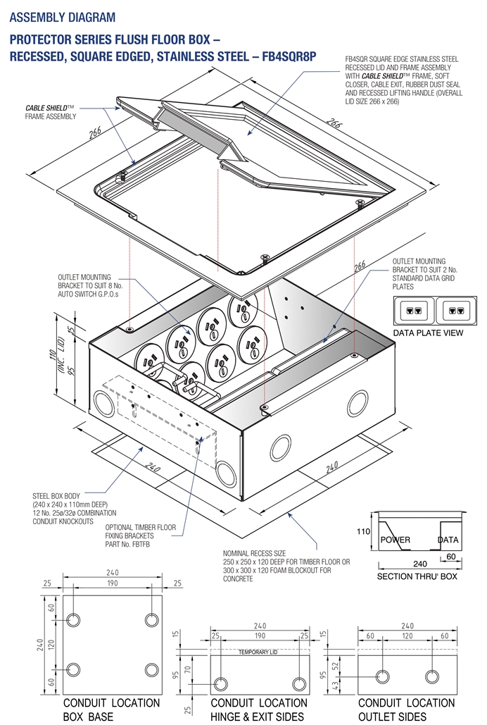 - Capacity for 8 Auto Switch G.P.O.’s & 2 standard Data plates (8 x power & 2 x Data and/or A.V.).