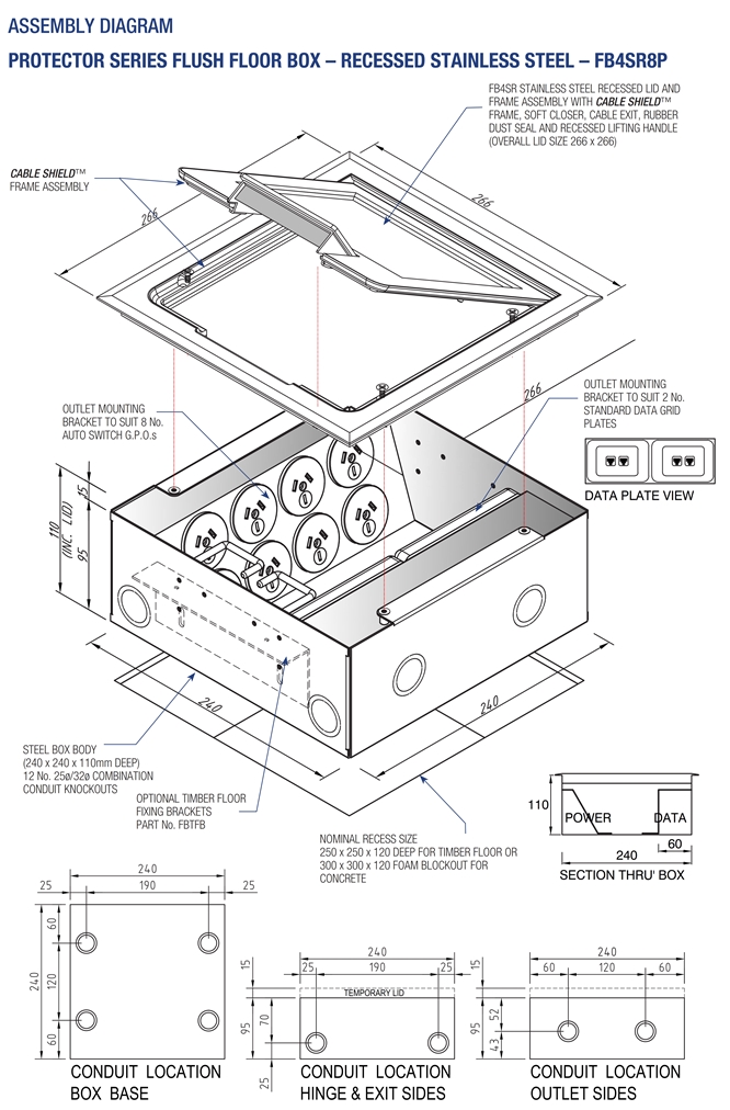 - Capacity for 8 Auto Switch G.P.O.’s (supplied) & 2 standard Data plates.