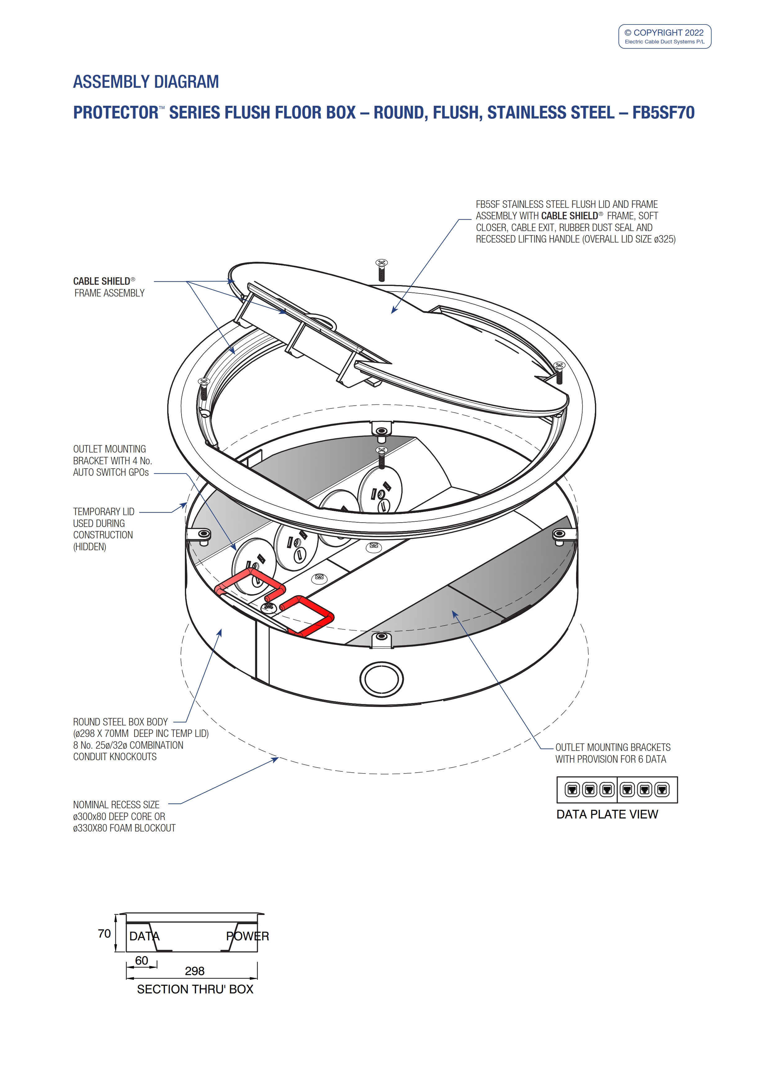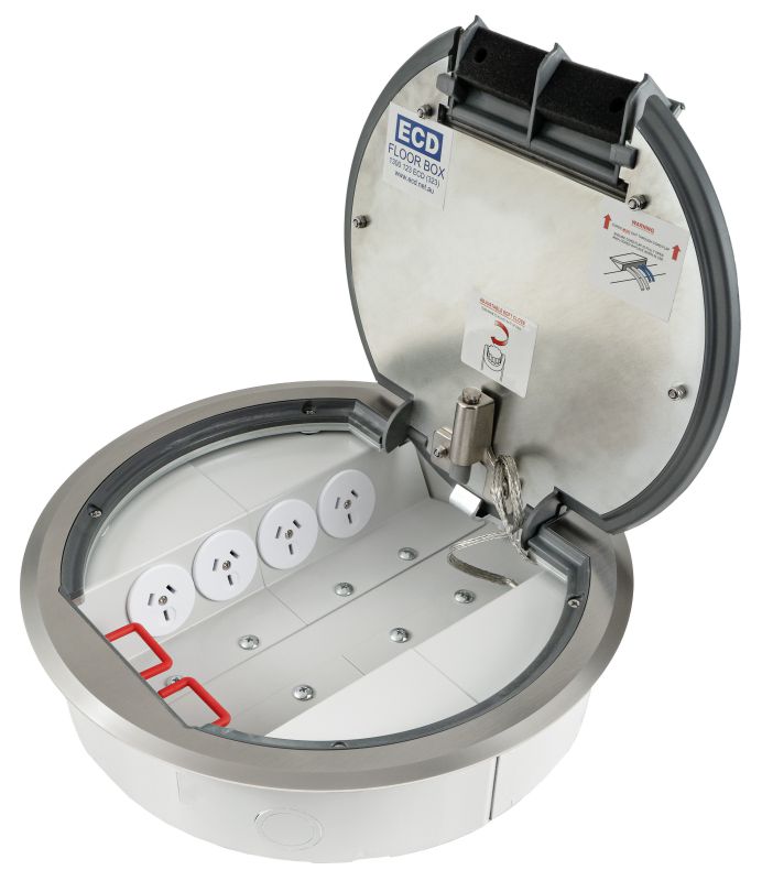 - The circular design of the canister and lid allows this box to be installed into existing concrete slabs. Simply core cut the appropriate size core hole and drop the floor box into position. No need to over cut and scabble square holes.
