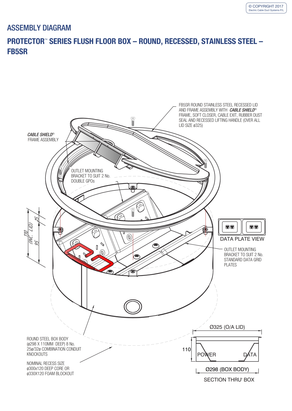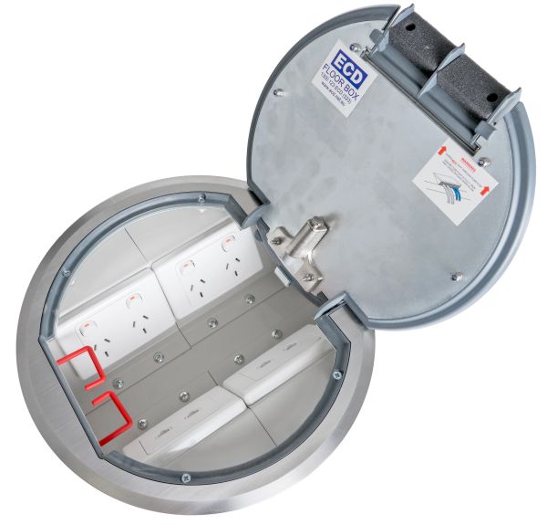 - The circular design of the canister and lid allows this box to be installed into existing concrete slabs. Simply core cut the appropriate size core hole and drop the floor box into position. No need to over cut and scabble square holes.