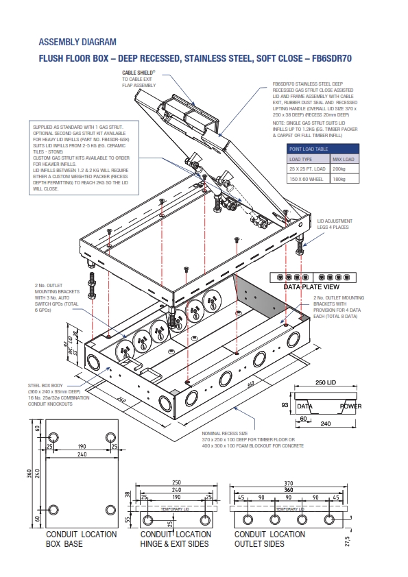 - Gas Strut Assistance to control lid closure – suits floor finish infills up to 1.2kg (eg. timber packer & carpet or full timber).