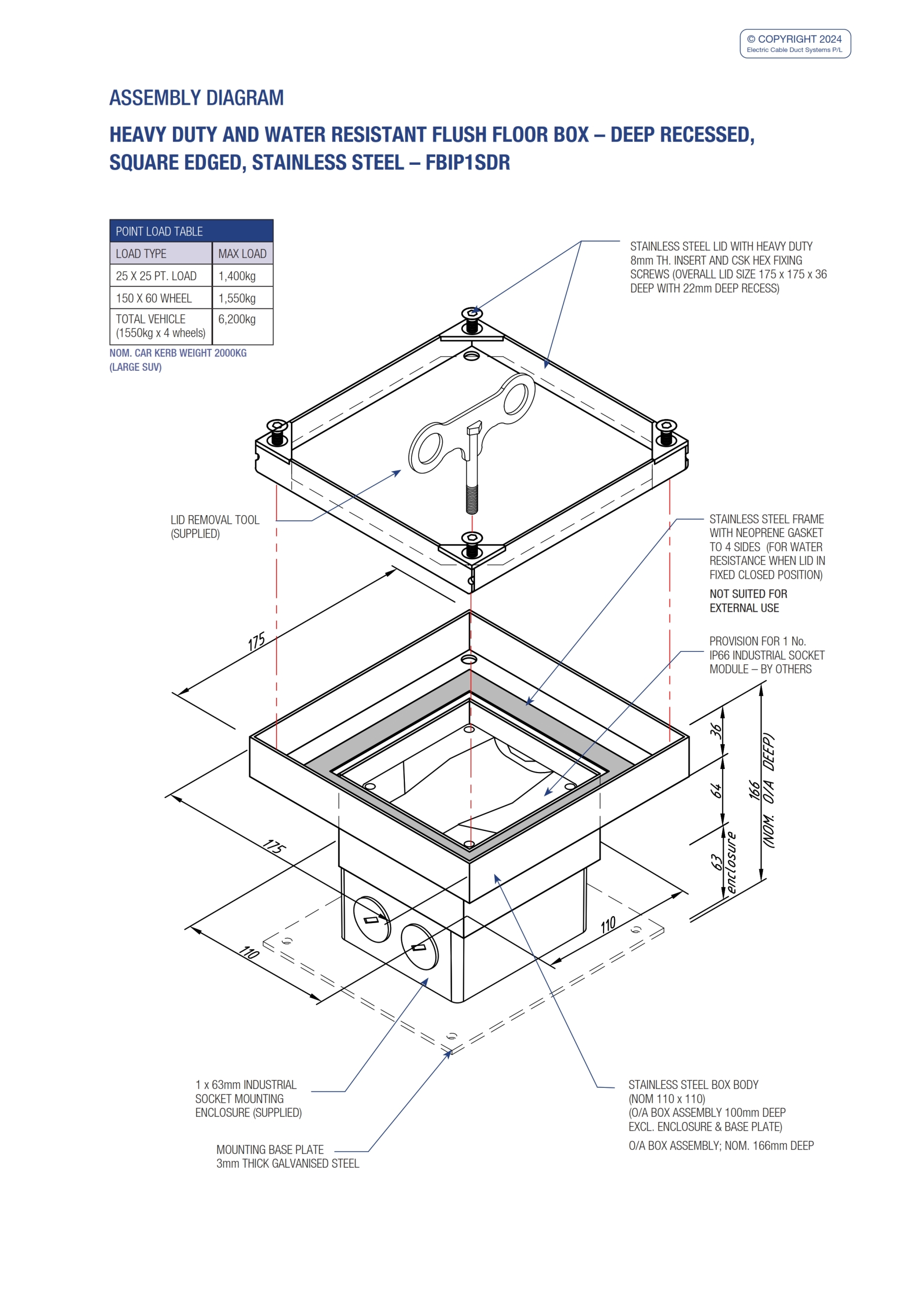 - Heavy duty – load rated floor box suitable for vehicular traffic.