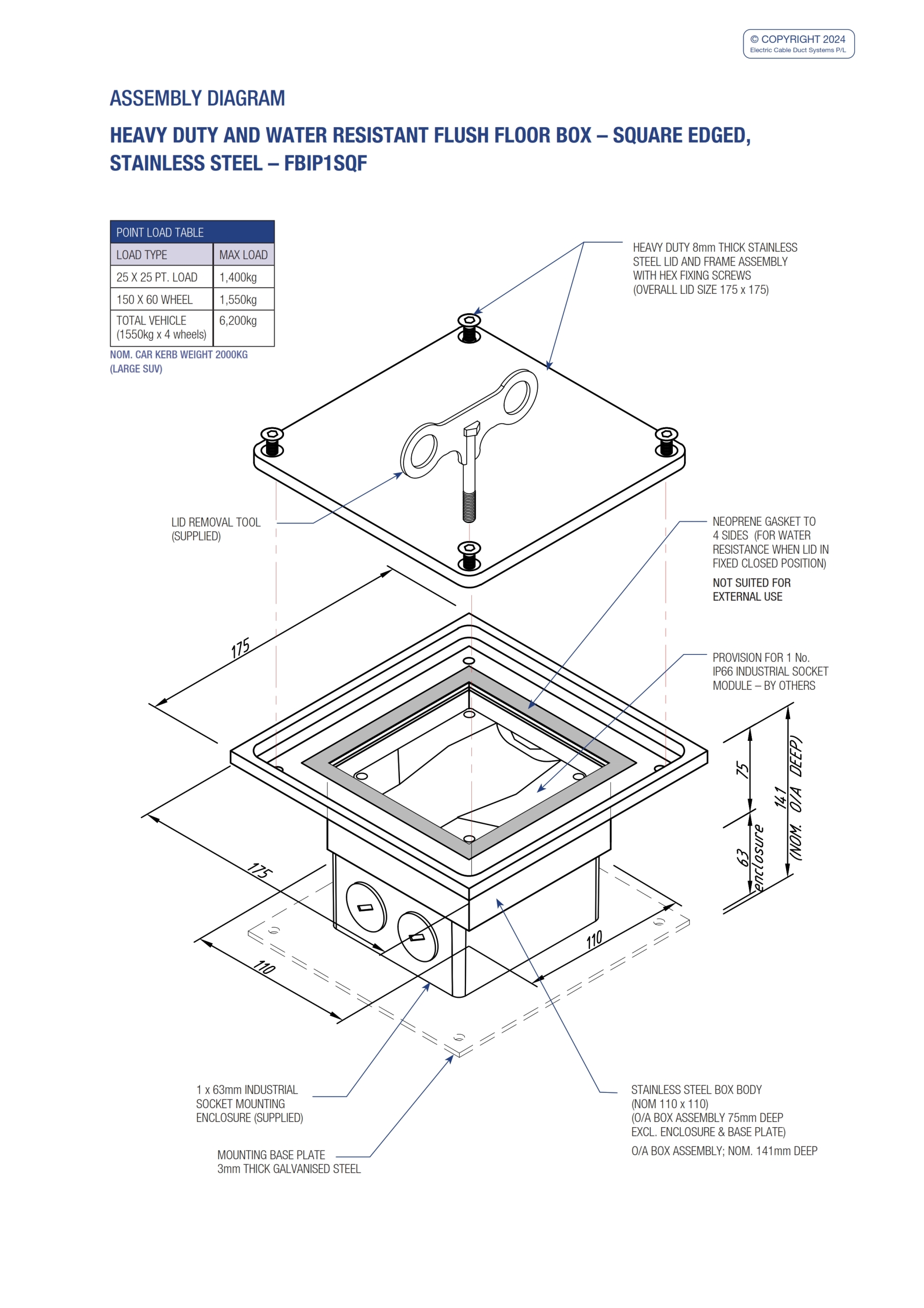 - Heavy duty – load rated floor box suitable for vehicular traffic.