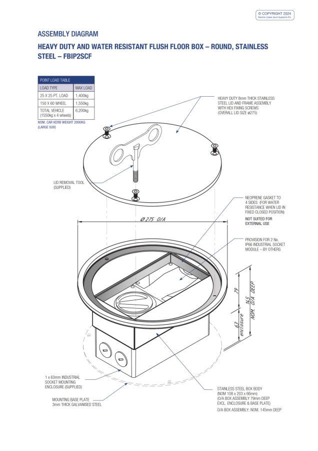- Heavy duty – load rated floor box suitable for vehicular traffic.