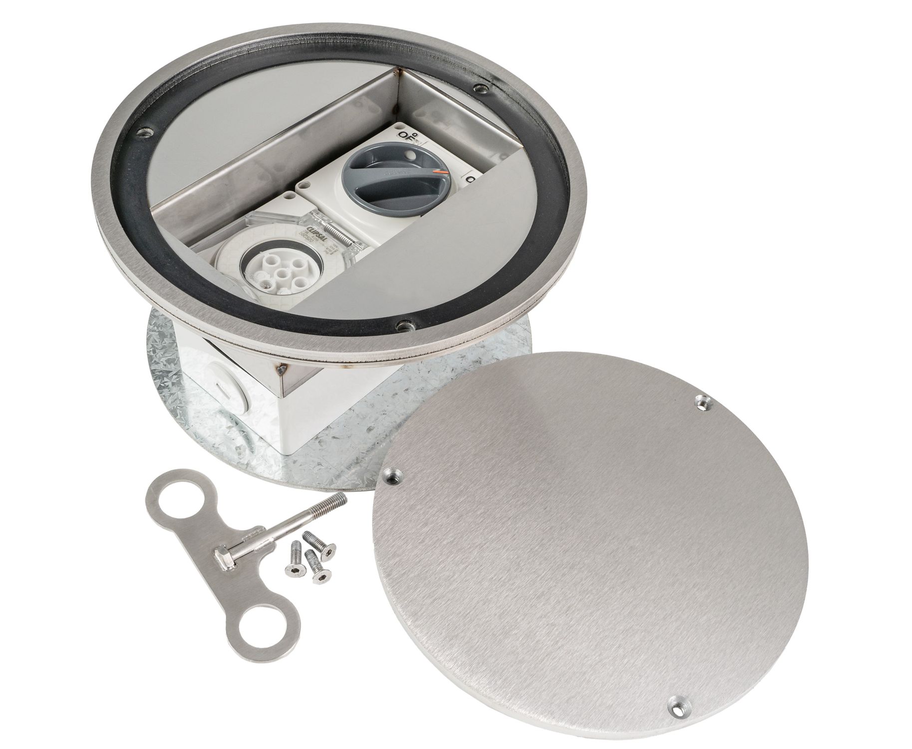 - Round, drop in, screw fixed lid with neoprene gasket (for water resistance when lid is in closed position). Note: Not suited for external use.
