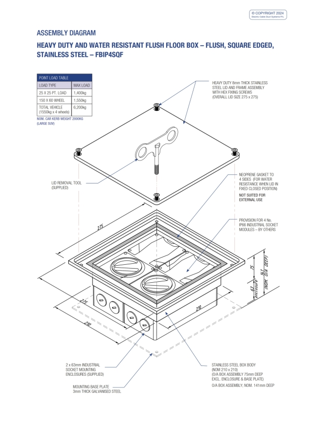 - Heavy duty – load rated floor box suitable for vehicular traffic.