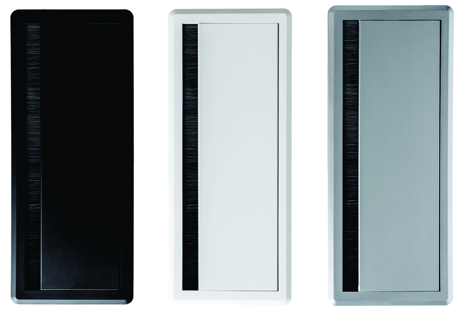 - Anodised black, white or silver aluminium in-desk box for soft wired power and data. Lid can be closed when in use.