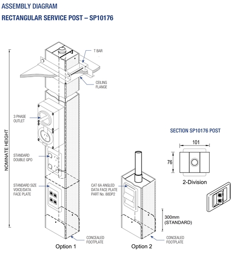 - A neat and attractive extruded aluminium post for the distribution of power and voice/data cables from the ceiling space to the work areas below.